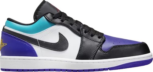 Decorados em uma paleta de branco, Court Purple, Tropical Twist, Varsity Red, University Gold e Black, esses tênis apresentam uma composição completa de couro. Para garantir respirabilidade, perfurações adornam a biqueira, juntamente com linguetas e forro de malha. O design do calçado apresenta painéis laterais brancos, acentuados com Swooshes pretos e sobreposições que emitem uma aura distinta de “Black Toe”. Adicionando um toque vibrante, o roxo domina a biqueira, as sobreposições do calcanhar e a sola de borracha, enquanto o azul-petróleo alinha as golas. Os saltos exibem orgulhosamente os logotipos Wings costurados em ouro universitário, enquanto as línguas e palmilhas exibem os logotipos Red Jumpman, tudo sobre uma entressola branca nítida.