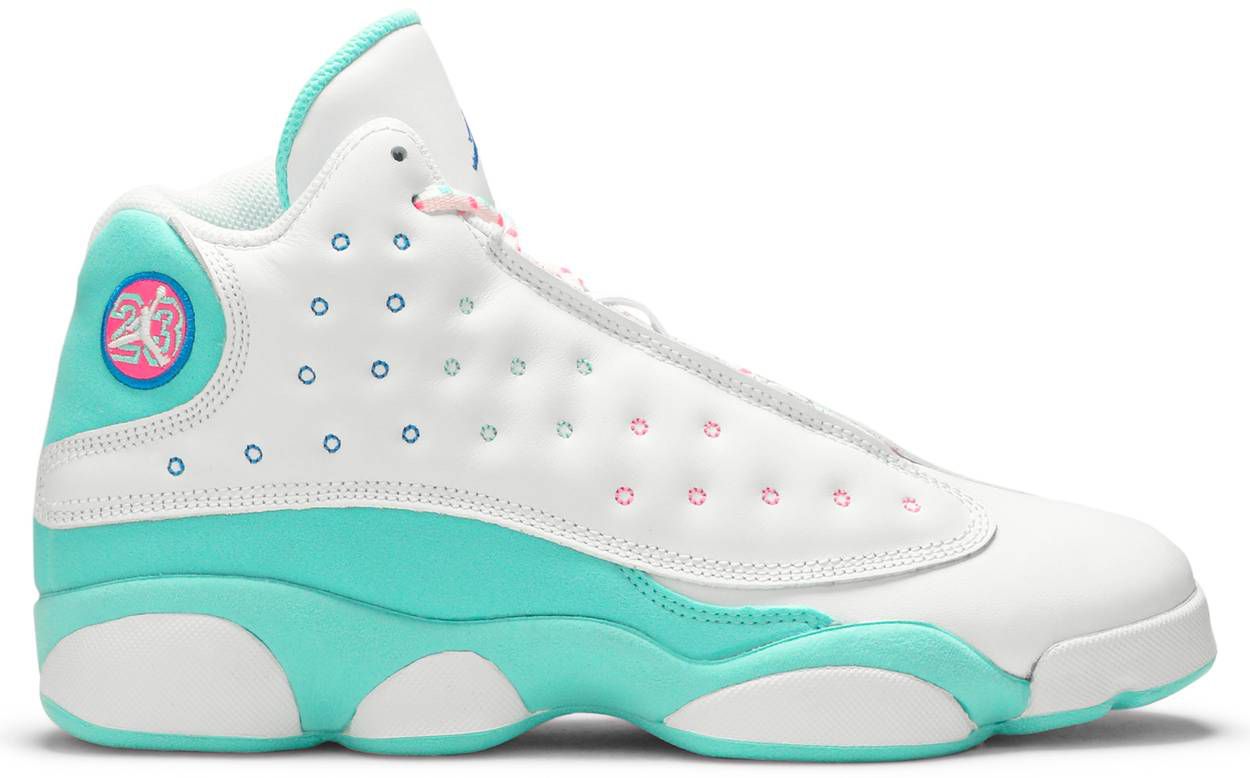 Elogiado por seu conforto dentro e fora da quadra, o Jordan 13 foi usado por "His Airness" durante sua última temporada com o Chicago Bulls em 1997-98. Esta tomada colorida apresenta uma base de feltro verde Aurora brilhante com painéis de couro branco e detalhes de costura em rosa, verde e azul. Um Jumpman azul bordado cobre a língua, enquanto uma aba rosa da marca Jordan aparece onde a língua se conecta ao dedo do pé. Este Air Jordan 13 troca o emblema holográfico “olho de pantera” no colarinho por um logotipo bordado do Jumpman com a marca “23”. Os laços de corda coloridos completam o design. O Air Jordan 13 GS “Aurora Green” foi lançado em 9 de maio de 2020.