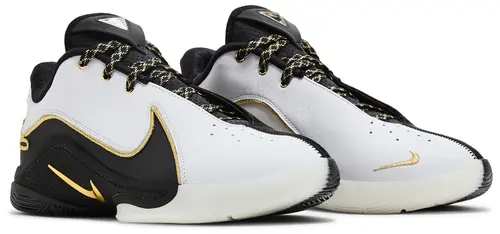 O Nike LeBron 22 'Mogul' apresenta bloqueio de cores divididas com detalhes dourados. Couro branco é utilizado no lado direito de cada sapato, com debrum metálico dourado que delineia o painel reflexivo que se estende do meio do pé ao calcanhar. No lado oposto, o couro preto brilhante apresenta o mesmo debrum dourado e base reflexiva. Os benefícios de desempenho incluem uma entressola Cushlon, reforçada com um selim em TPU e aumentada com amortecimento Zoom Air no antepé e no calcanhar.