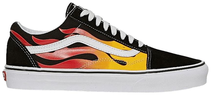 Este colorway “Flame” adiciona uma estética flamejante ao cabedal para uma opção divertida para aqueles que procuram algo fora do comum. Camurça preta durável aparece na ponta do pé, ilhós e calcanhar. A lona preta pontilha os dois lados e a costura branca em contraste ao longo de cada painel fornece detalhes sutis, mas bem-vindos. Rendas de algodão branco e uma sola intermediária branca vulcanizada com uma sola de waffle de goma para maior aderência enquanto patinação finalizam o visual.
